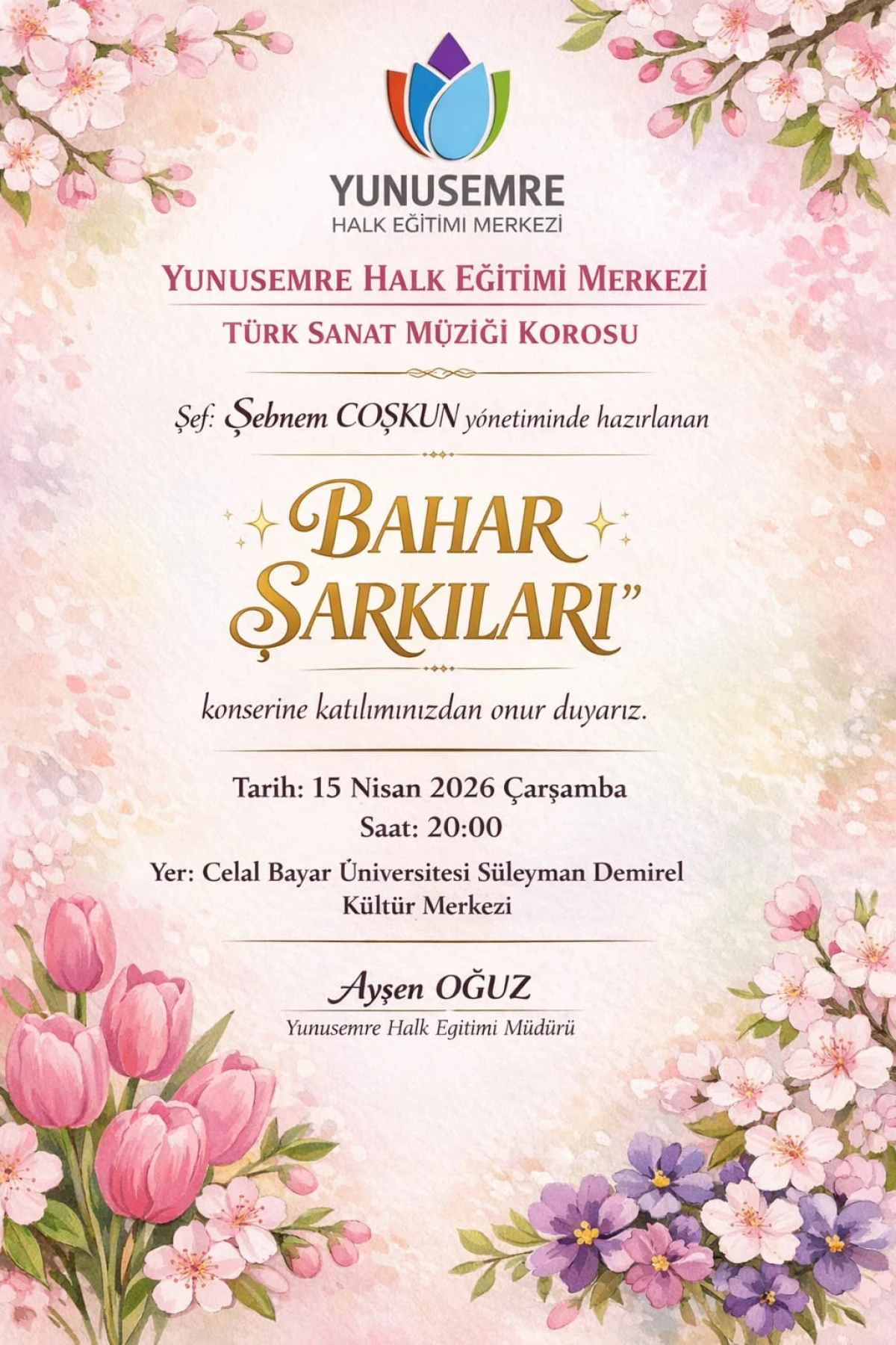 Yunusemre Halk Eğitimi Merkezi Müdürü Ayşen Oğuz, tüm Manisalıları konsere davet ederek, sanatın birleştirici gücüyle baharın güzelliklerini birlikte yaşamaya çağırdı. Ayrıca Ayşen Oğuz müzik dolu bu özel gecede sanatseverleri ağırlamaktan mutluluk duyacaklarını söyledi.
